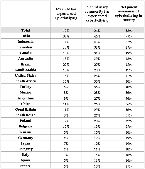 The following table demonstrates parents’ attitudes to cyberbullying in 24 countries, including whether or not their child has been cyberbullied.