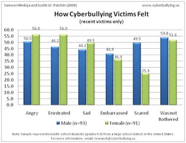 According to the Cyberbullying Research Center both boys and girls are likely to report feeling angry, sad, and embarrassed.